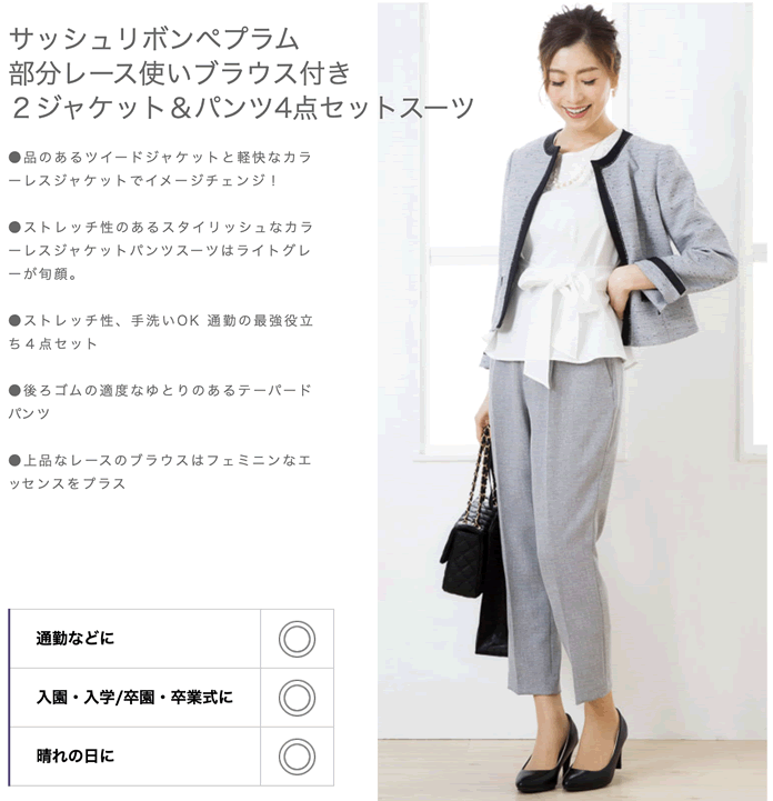 ●ストレッチ性、手洗いOK 通勤の最強役立ち4点セット ●後ろゴムの適度なゆとりのあるテーパードパンツ ●上品なレースのブラウスはフェミニンなエッセンスをプラス 通勤などに 入園・入学/卒園・卒業式に 晴れの日に ※ モデルサイズ 身長165cm/バスト85cm/ウエスト59cm/ヒップ84cm 着用サイズ9号 セット内容 カラー&スタイル 【関連商品】ママスーツ コサージュ&バッグ進呈▼ ▼ORDER