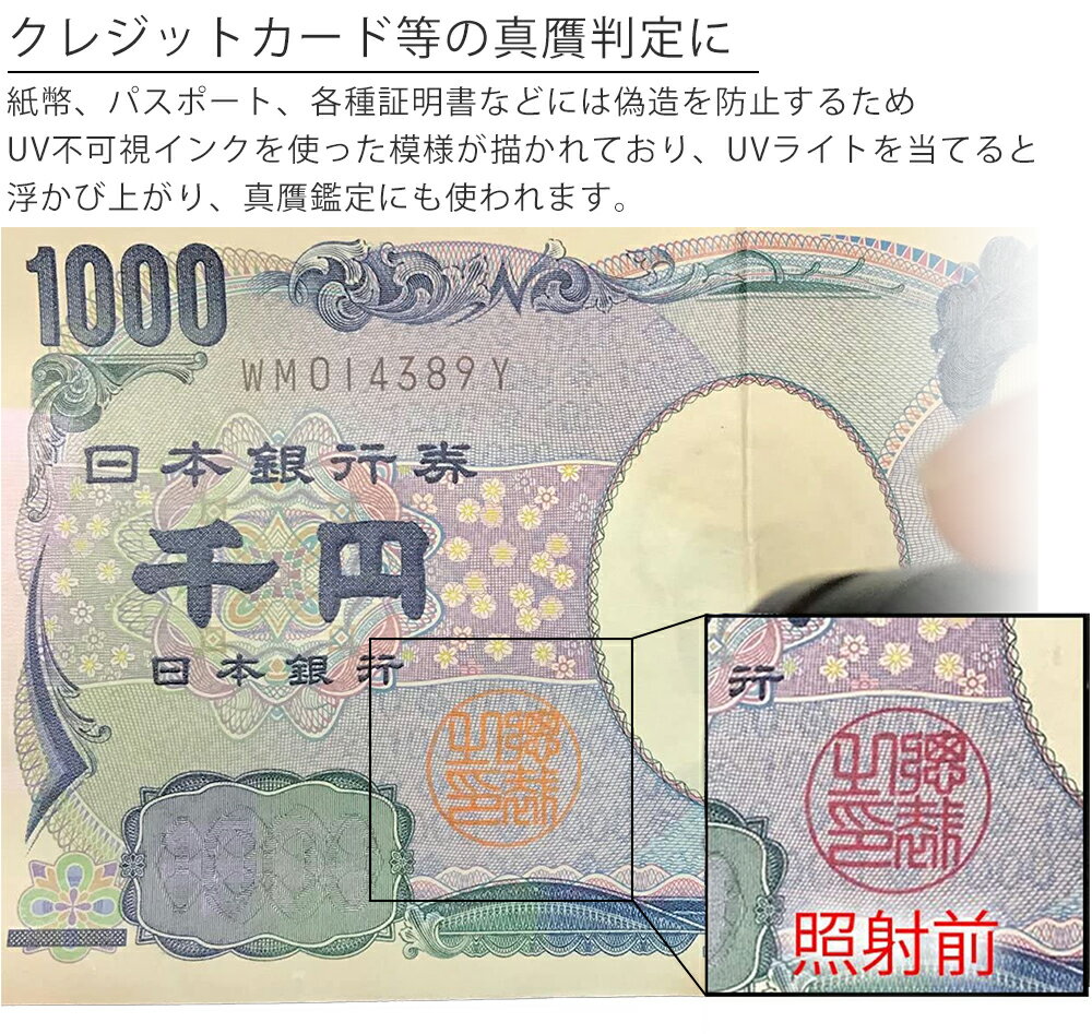 クレジットカード等の真贋判定に! 紙幣、パスポート、各種証明書などには偽造を防止するためUV不可視インクを使った模様が描かれており、UVライトを当てると浮かび上がり、真贋鑑定にも使われます。